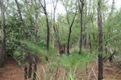車で移動していると草地や背の低い樹木林を頻繁に見かける。標高が高いところで見られるような低木林が、薄い土壌による乾燥と強い海風によって形成されている。特にシマイスノキを主体とする低木林を乾燥低木林(狭義)と言い、小笠原を象徴する植生である。